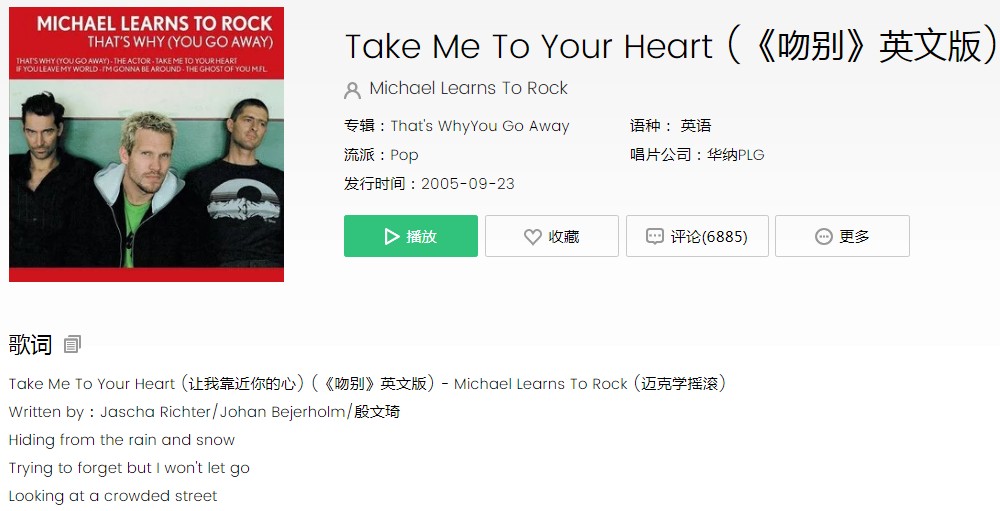 这首歌是Michael Learns To Rock演唱的《Take Me To Your Heart》