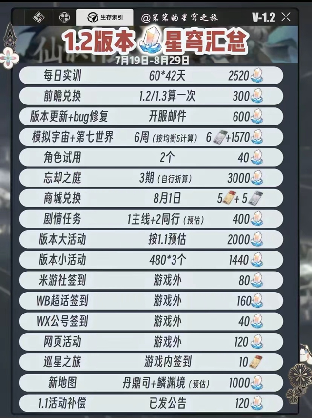 9、版本大活动:按照1.1预估共计2000星穹